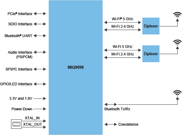 88Q9098汽车无线SoC系列是业界首个基于最新IEEE 802.11ax标准的Wi-Fi 6解决方案,支持2x2+2x2并发双Wi-Fi和双模蓝牙 5.3。在日益拥挤的汽车环境中,提供可靠的高性能无线连接变得越来越困难。全新的88Q9098组合解决方案可为汽车提供千兆级性能、卓越的可靠性和增强的安全性,并在提供全面的Wi-Fi 6解决方案方面提升了领导地位。我们创新的并发双Wi-Fi架构开创了新技术先例,将两个完整的Wi-Fi子系统集成到单个SoC中,并使两个独立的2x2数据流可以并行或以全吞吐量来运行。
