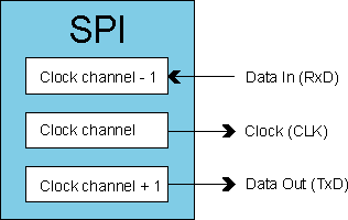 The SPI function uses three eTPU channels to form a bi-directional, synchronous serial port that can be used to communicate with a wide variety of devices. It can be used to add serial capabilities to a device without a serial port, or to add further serial port(s) to a device that already has a hardware-synchronous port. The function requires no host CPU's intervention once the function has been initialized and a request for data transmission has been made. One eTPU channel is configured to function as the clock and the other two are configured to function as serial transmitter (TxD, or 'data out') and serial receiver (RxD, or 'data in'). The eTPU SPI function provides similar functionality to the TPU3 SIOP function. Peripheral Chip Select (PCS) functionality is not provided by the eTPU SPI function but could be easily implemented using GPIO eTPU function.